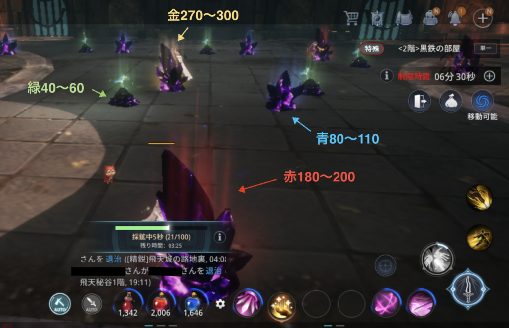 短時間でたくさん稼ぐならここにつきます。まあ、入場券配布の都合上、無課金は1日2回までしか行けませんが。。黒鉄にはいくつか種類があり、掘れる黒鉄量が違います。以下、目安です。