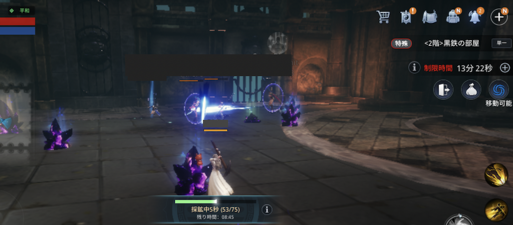 金黒鉄だと300黒鉄×100回掘り=30000黒鉄ほど入手できます。まあでも、赤黒鉄以上は攻撃されて奪われやすいです。また、黒鉄部屋にどれだけ早くたどり着けるかは運次第なので、それによって稼ぐ黒鉄量も変わります。30分で1度も黒鉄部屋たどり着けないこともありました。泣