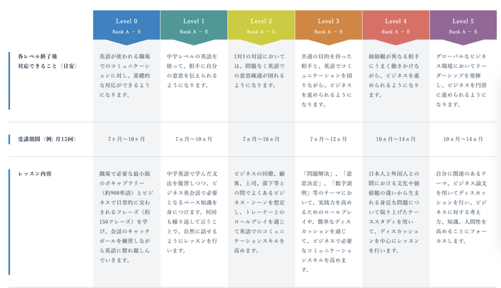 ビズメイツのレベルについては以下の通りです。1レベル上げるための受講期間は7ヶ月〜10ヶ月とちょっと長い印象です。レベル2の私がレベル5まで到達するには、順調に行っても4年程度かかるという計算になります。