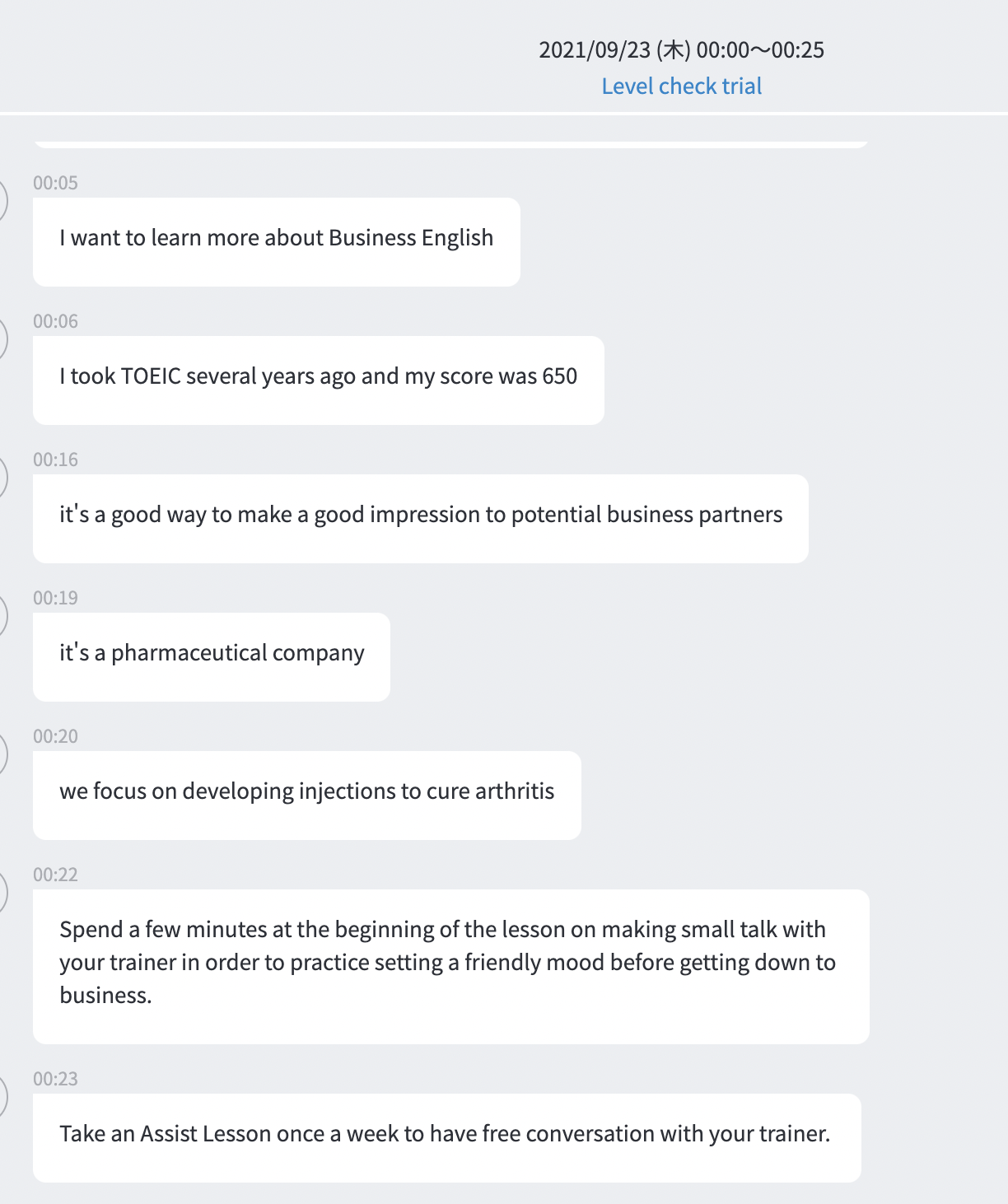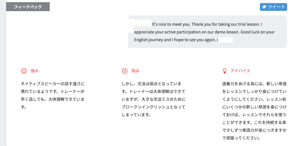 今回は無料体験のみでしたが、レベルチェックを受けるだけでもとても勉強になりました。時間もギリギリまで、内容詰め詰めのレッスンでした。フィードバック内容も自分がダメだと思った点がしっかりと抽出されていたので品質の高いレッスンだと思いました。無料でできるので、興味ある方はぜひレベルチェックテストだけでも受講してみてはいかがでしょうか。