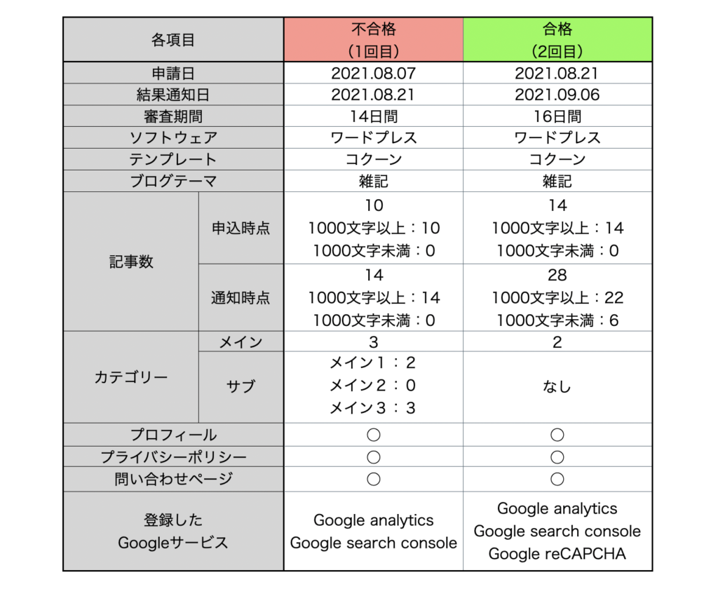 結局、なぜ合格できたかははっきりはわからないですが対策したことが的外れではなかったようです。ちなみにもし2回目も不合格であった場合には、全ての記事について文字数を1000文字以上として、雑記ではなく特化ブログとしてから申請しようと考えていました。今回の内容が皆様の参考とできましたら幸いです。